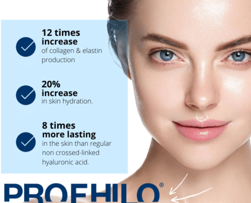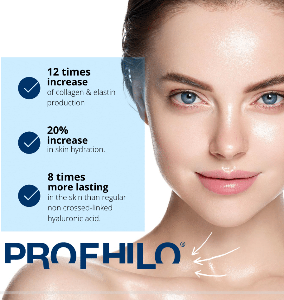 Profhilo is een product met natuurlijk hyaluronzuur dat de huid intens hydrateert, zichtbaar steviger en gladder maakt. Uniek aan Profhilo is dat het geen volume toevoegt, zoals gewone fillers dat wel doen. Het past bij ieder huidtype en verstrakt ook de huid in de hals.